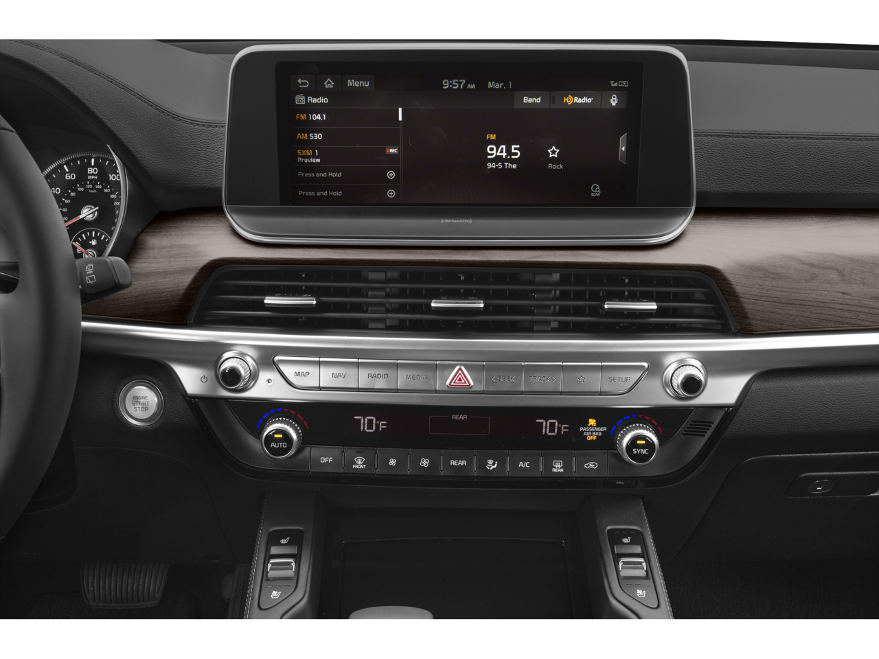 • Radio: AM/FM/MP3/SiriusXM Audio System -inc: UVO link infotainment system, w/smartphone integration for remote commands and remote vehicle status, 6-speaker, support for Android Auto and Apple CarPlay, 10.25" Thin Film Transistor (TFT) touch-screen display, navigation, a total of 6 USB charge ports in all rows, Bluetooth wireless connectivity w/voice recognition (a Bluetooth enabled cell phone is required to use Bluetooth wireless technology) and Multi-Bluetooth connectivity, allowing 2 phone connections simultaneously